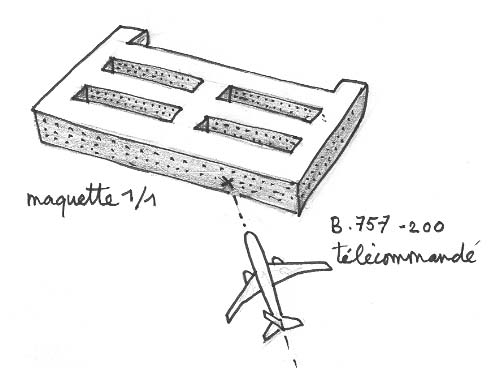 Il y aurait un expérience simple à faire et d'un coût abordable : effectuer une* reconstitution*. L'affaire est si grave que le chose demanderait à être éclaircie. Pour ce faire il suffirait de construire dans un lieu quelconque une maquette à l'échelle 1/1 de la partie concernée du Pentagone, sur le simple plan mécanique : murs, cloisons, toitures, fenêtres. Les dessin ci-dessous montre qu'il suffirait de reconstituer une toute petite partie du bâtimùent. Il faudrait ensuite bourrer ensuite de kérosène un 757-200 en bout de potentiel, prêt à partir à la casse et le doter d'un système de télécommande. Eventuellement (cela vaut la peine d'être fait !) installer à son bord, de même que dans les bâtiments touchés, des corps d'êtres humains, pilotes et passagers. Puis diriger tout cela vers le point d'impact estimé.