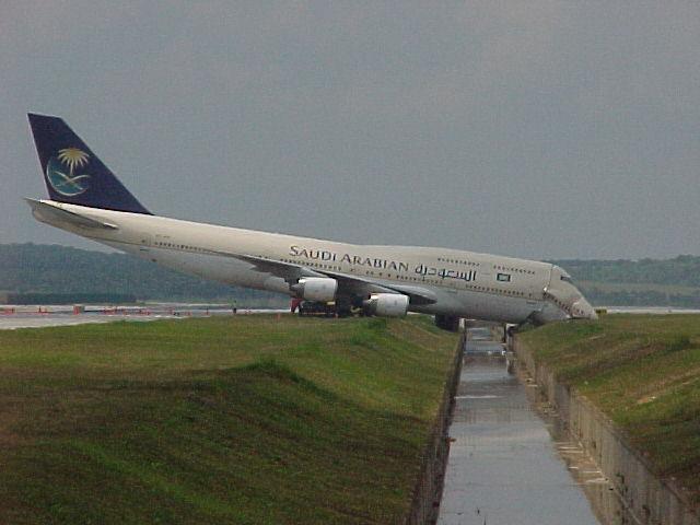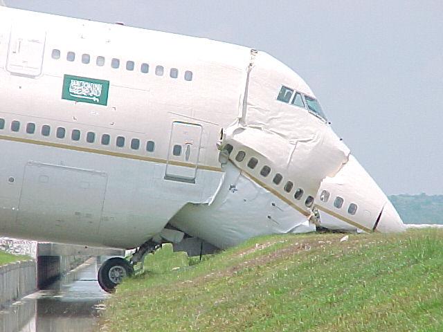 Il y a un autre éléments. Un lecteur, Florian Leforestier, m'a fait suivre deux clichés se référant à un décollage ou à un atterrissage raté d'un 747. Celui-ci, en bout de piste, s'en est aller se tanquer dans un fossé. Il est vraisemblable que l'impact a du s'effectuer à vitesse très modérée, en fin de freinage, comme en témoigne l'attitude de la jambe de train avant, à peine repliée. Noter la manière dont l'avant s'est trouvé écrasé. En tant qu'ancien ingénieur de l'aéronautique je sais que la partie avant d'un appareil civil est assimilable "à du papier de chocolat". Il faudrait que quelqu'un nous explique comment l'avant d'un 757 aurait pu perforer plusieurs cloisons de béton successives, lors de ce crash sur le Pentagone. .