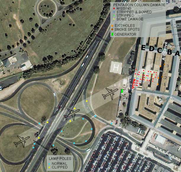 A propos des lampadaires proches du Pentagone les choses n'ont pas été non plus éclaircies, d'autant plus qu'il est attesté que des lampadaires avaient été déposés avant l'évènement du 11 septembre, pour travaux. Dans tous les cas de figure les autorités Américaines ont fait de leur mieux pour que toute trace disparaîsse et que toute enquête devienne impossible ( ne serait-ce qu'en reconstruisant immédiatemnt la partie du Pentagone qui a été détruite au plus vite. Les travaux ont débuté deux jours après. Les travaux de reconstruction, largement déployés ont tout effacé).