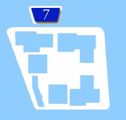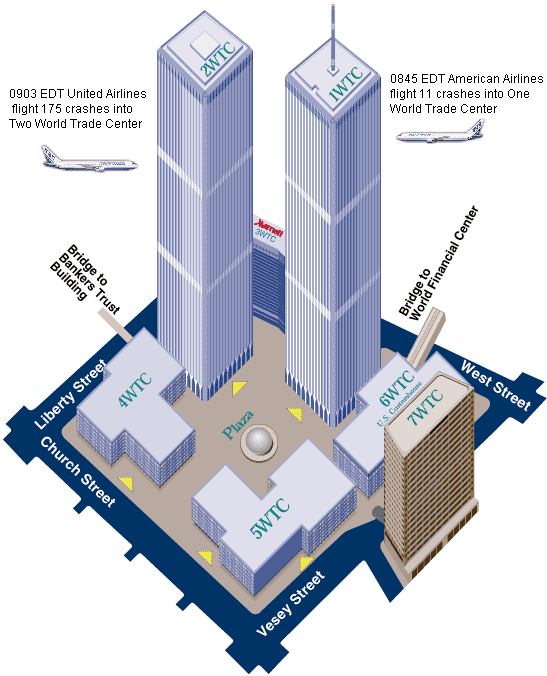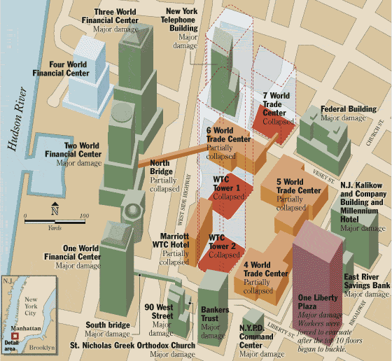 On sait qu'après l'effondrement des twin towers un bâtiment voisin subit également ce spectaculaire collapse. Un plan indique d'abord la localisation de celui-ci. Il n'est pas tout contre les tours, mais deux blocs plus loin. Les tours jumelles, de section carrée, sont aisément localisables. Ce bâtiment est indiqué en bleu marine et frappé du chiffre 7.