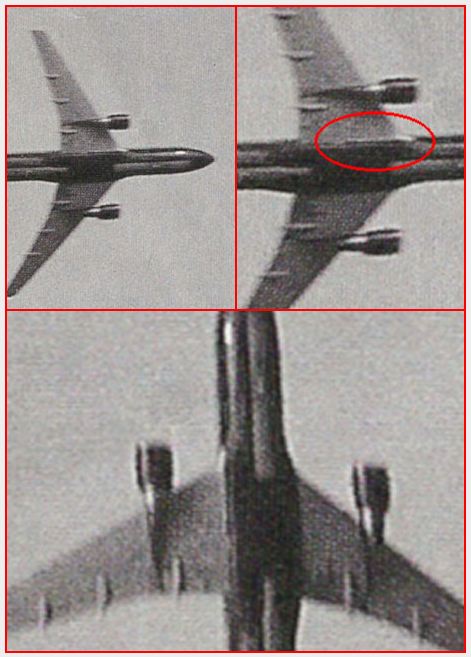 • Dernière remarque : il est difficilement imaginable qu'un avion civil se présentant sur un runway avec un "gadget" aussi insolite ait pu passer inaperçu des contrôleurs d'aéroport, ou même de multiples témoins, passagers ou employés. Mais, dans cette affaire, tout reste possible, comme le fait que cet appareil ait été un avion militaire, ou militarisé, spécialement équipé, tandis que l'avion de ligne aurait été détourné pour être détruit au dessus de la mer, après que l'ont ait pris le contrôle de ses commandes de vol par télécommande et neutralisé ses moyens de télécommunication. Qu'on pense au caractère insolite de la destruction de l'appareil au dessus de la Pennsylvanie, où on a retrouvé force débris à des kilomètres d'un point d'impact, exempt de débris, ressemblant fort à celui d'une simple bombe.