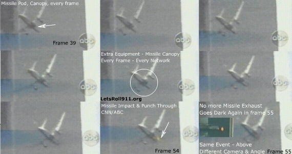 Cette image est censée représenter l'un des avions juste avant l'impact sur l'une des Twin Towers. A moins que cette photo n'ai été truquée on distingue nettement, sur la carlingue, fixé de manière dissymétrique, un "pod", un gros container externe comme peuvent en porter parfois les avions militaires. Ce pod semble d'un diamètre supérieur à celui des moteurs eux-mêmes. Ceux qui ont analysé cette vidéo, image par image, désignent ce qu'ils interprètent comme un tir de missile, juste avant contact. Il existe différentes vidéos de cet impact, prises sous des angles différents. Jointe à l'image qui est en bas et à droite se trouve une image prise de profil où on voit ce qui ressemble à un impact explosif (lueur).
