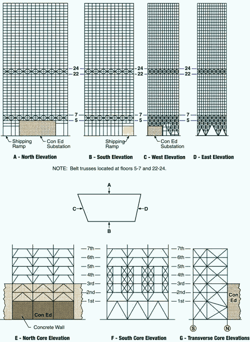 Cette géométrie se prête à une thèse selon laquelle le kérosène des avions, pénétrant par un orifice de cette cage de béton, aurait pu ruisseler à l'intérieur, brûler (évec quelle sources d'air frais ?). D'où un ramolissement des sutrctures métalliques et finalement une implosion des deux bâtiments. Pour le bâtiment 7, la structure est différente. Voir ci-dessous. C'est ce qu'on appelle une structure "cantilever", où le bâtiment se trouve pris dans un réseau de poutres métalliques entrecroisées.