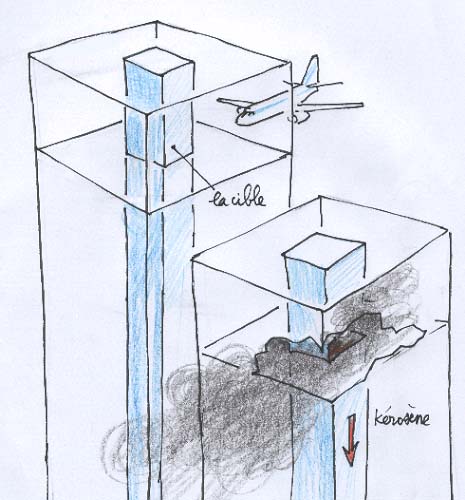 Cette affaire du 11 septembre continue donc d'être fouillée par des enquêteurs privés américains. Nous avions (voir une image reproduite plus haut dans cette page) envisagé une thèse concernant la cause de l'implosion des tours jumelles. On sait que celles-ci étaient, structurellement parlant, accrochées littéralement à une sorte de pilier central, constitué par des éléments métalliques logés dans une espèce de cage en béton. L'idée était que les appareils, en percutant les tours et en traversant aisément, comme le démontre les films, les frèles structures (planches, parois de verre) constituant les étages aurait pu percuter ces cage bétonnées et pratiquer des ouvertures à l'intérieur desquelles le kérozène contenu dans les réservoirs (ceux des appareils étaient pleins et correspondaient à des vols transcontinentaux) aurait pu ruisseler. Mais pour que du kérozène brûle, il faut de l'oxygène. Or, comment assurer la combustion de celui-ci dans ces cages fermées, a priori sans appel d'air possible ? On tombe sur un nouveau problème où la réponse ne pourrait venir que d'études techniques, voire de simulations vraie grandeur.
