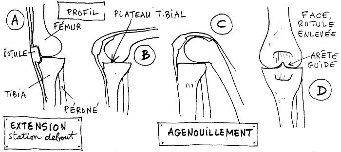 Plateau tibial. Notez à quoi sert la "rotule" : déport des attaches des tendons et verrouillage avant