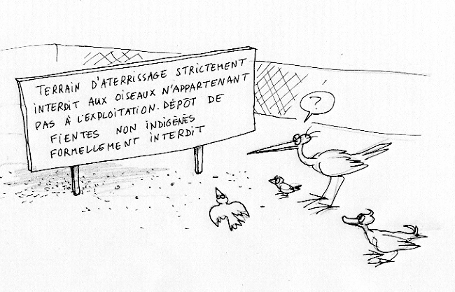 Car les oiseaux migrateurs se restaurent. C'est pour eux une nécessité. On ne couvre pas des milliers de kilomètres le vendre vide. Ces oiseaux mémorisent d'ailleurs très bien "les bons coins". Leur système de navigation est étonnant. Tous ne volent pas que le jour, d'ailleurs. Pour préserver des exploitations, grandes ou petites, il aurait fallu protéger les aires d'évolution, à l'extérieur, des rejets de fientes. Aujourd'hui, dans la panique générale on décrète le confinement généralisé. D'une part les exploitants qui travaillent sur une grande échelle vont avoir des pertes considérables ( outre la perte de leur fameux label "poules élevées en plein air" ). Les oiseaux vontre s'entretuer. D'autre part les petits fermiers n'ont tout simplement pas poulaillers pour y confiner leurs volailles. S'ils avaient été prévenus plus tôt ils auraient pu prendre des mesures minimales, construire un abri couvert par quelques mètres carrés de tôle ondulée, bordée sur les côtés par du grillage. Suffisant pour empêcher les migrateurs de faire leurs besoins au milieu de ces volatiles domestiques. Mais comme rien n'a été dit, rien n'a émané de ces "celules de crise" qui ne sont pas précisément dominées par l'imagination nous trouvons des dizaines de milliers de petits fermiers qui, montrant des abris visiblement trop exigûs s'écrient "mes poules, mon bon monsieur, où voulez-vous que je les mette !?"