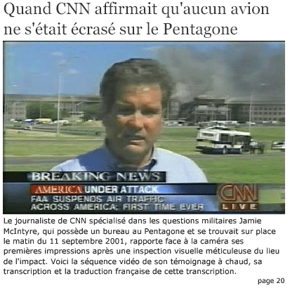 Dans son numéro du 1° mars 2005 le journaliste Thierry Meyssan poursuit inlassablement sa démarche de journaliste d'investigation. Lorsque se produisirent les évènements du 11 septembre ( sur lesquels monsieur Antonio Fischetti n'a probablement jamais fait d'enquête, une "rapide vérification" ayant tenu lieu pour lui " d'investigation sérieuse" ) il y avait nécessairement à Washington nombre de journalistes prêts à intervenir très rapidement. Dans les minutes qui suivirent l'évènement du Pentagone un journaliste de la chaîne américaine CNN, Jamie Mac Intyre, bien connu des téléspectateurs américains, se trouvait sur les lieux. Il se trouve que son bureau est dans les locaux mêmes du Pentagone ! Thierry Meyssan est allé dénicher la séquence où celui-ci témoigne en direct ( mention "live", sur l'écran ) :