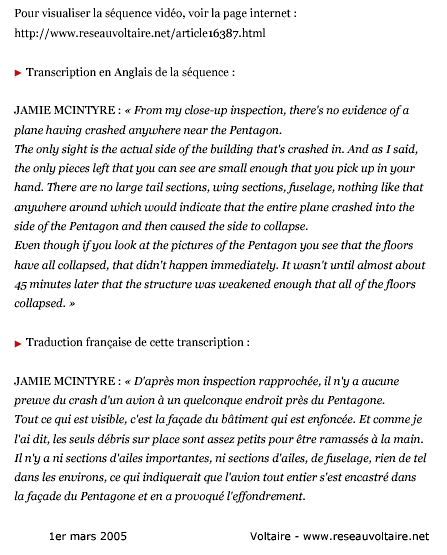 Nous avons ici la retranscription de l'intégralité de l'interview, c'est à dire l'extrait, plus le contexte. Au lecteur de juger. Il ne nous semble pas que la prise en compte de l'intégralité du document modifie sensiblement l'impression qui se dégageait de la lecture de l'extrait diffusé par l'intermédiaire du journal du Réseau Voltaire. Jamie McIntyre, correspondant de CNN était dans le Pentagone au moment où le bâtiment a été frappé. Il s'est alors rendu près du point d'impact et a procédé aux premières constatations.
