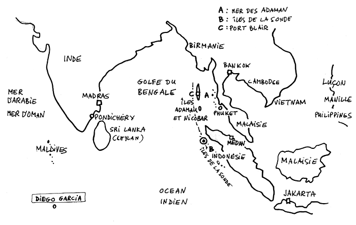 Les réactions des lecteurs à propos de la question que j'avaixs posée, concernant la base de Diedo Garcia, où sont stockés les B2 américains ont été nombreuses et leurs enquêtes assez complètes. D'après les photos prises par satellite les îles Chagos et la base de Diego Garcia situées à 3200 km à l'ouest de l'épicentre et dontg l'altitude ne dépasse pas huit mètres ne semblent ne pas avoir souffert le moins du monde du tsunami.