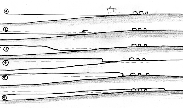 • En 5 l'eau atteint son extension maximale ( point B ), envahit la plage, mais n'atteint pas les habitations - En 6 ( C ) le front liquide amorce son mouvement de retrait.