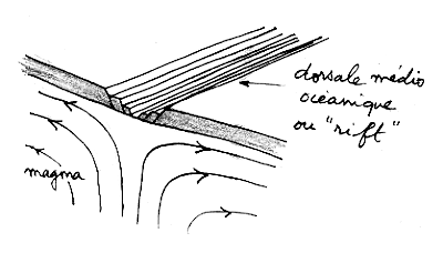 La vaste plaine sous-marine qui s'étent sous l'Atlantique résulte de la solidification du magma après séparation initiale des continents, idée lancée pour la première fois par le météorologie Wegener. La mise en évidence de la dorsale courant dans toute la partie médiane a confirmé brillamment cette idée audacieuse. L'Islande n'est qu'une partie émergée de cette"épine dorsale" et cette île se trouve d'ailleurs barrée su sud au nord par ce même système de faille. Celle-ci s'élargit sans cesse, tandis que du magma monte en surface et se solidifie. On peut assimiler cette région de la croûte terrestre à une cicatrice sur laquelle on tire et qui n'en finirait plus de re-cicatriser. Quand cette partie de la dorsale est visible on assiste alors un un certain type de volcanisme, comme en Islande. Au fond des océans l'épanchement de la lave donne des champs de "pillow lava" des formations évoquant des oreillers ou des traversins solidifiés. On a filmé à plusieurs reprises ce type de volcanisme sous-marin, très spectaculaire où la lave se refroidit très vite à cause de la forte conductivité thermique de l'eau de mer.