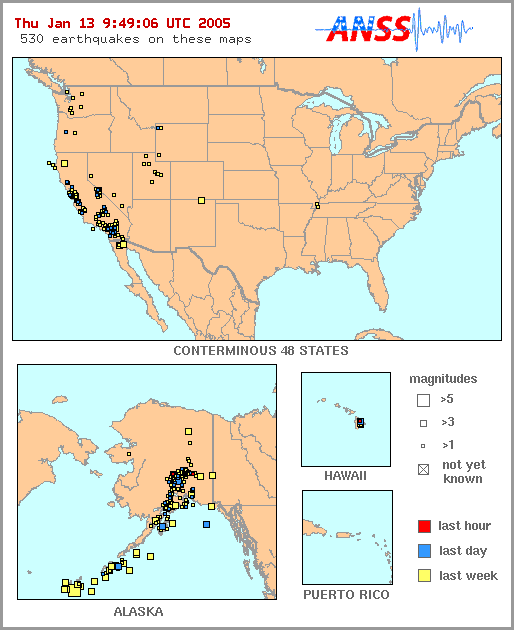 13 janvier 2005 : Le site http://earthquake.usgs.gov indique les séismes récents aux USA :