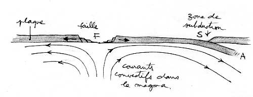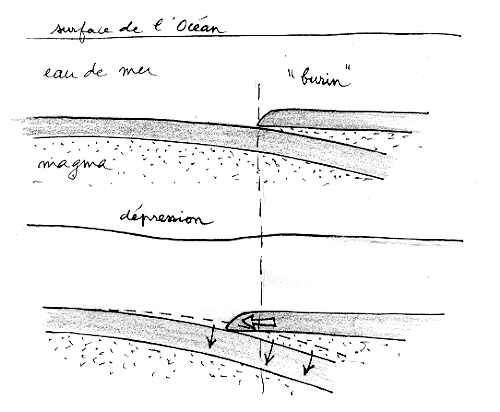 Les continents formaient une croûte initiale nommé "Gondwana". Il n'y a pas de différence de nature entre la magma fluide subcrustal et la couche solidifiée, si on excepte une pellicile correspondant aux terrains sédimentaires. On peut comparer les plaques superficielles à de la glace flottant sur de l'eau. Il vous est peut être arrivé de voir des plaques de glace dériver lentement sur un cours d'eau paresseux. Si le froid est très vif la glace peut se reformer entre ces "banquises", ce qui est l'équivalent de la solification du magma terrestre. On peut voir aussi des plaques se chevaucher. S'il neige, la plaque supérieure peut tasser la neige et faire apparaître une sorte de bourrelet. C'est ainsi que se forment les Alpes ou la chaîne Hymalayenne, ou la cordilière des Andes, au fil du glissement de deux plaques tectoniques l'une sur l'autre. Sagissant des mouvement affectant la croûte terrestre dans une zone de subduction la plaque inférieure s'enfonce dans le magma selon un angle assez prononcé. Comme la température des couches profondes est plus importante celle-ci fond et se mêle au magma lui-même ( ragion indiquée par la lettre A ).