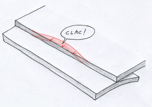 La plaque de gauche est descendue par rapport à sa position initiale indiquée par une ligne tiretée. En parallèle une dépression se produit à la surface de la mer, juste au dessus. Il est facile d'imaginer l'énergie qui est liée à cette dépression. Pour ce faire il suffit d'enfoncer une cuvette à la surface de l'eau, puis de la relever vivement. L'énergie à dissiper sera égale à celle qu'il vous aura fallu développer pour enfoncer la cuvette en luttant contre la force d'Archimède.