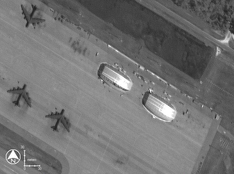 Je ne sais pas de quand datent ces photos. Sur la vue de satellite on disting, à droite du tarmac deux hangars matériau léger qui censés abriter les B2 contre "les rigueurs des intempéries". Leur revêtement antiradar serait "assez fragile". Bizarre pour des appareils qui, volant à haute altitude ramassent des UV à tout va. On imagine aussi mal des bombardiers susceptibles d'opérer à tout moment qui craindraient ... les intempéries. Ces hangars ne sont pas visibles sur les autres photos. Peut être servent-ils à cacher les B2 des regards. Mais pourquoi cela si ces appareils ont déjà été photographiés cent fois sous toutes les coutures ? A moins que les "vrais B2" diffèrent quelque peu deceux qu'on montre ? Dernière hypothèse : que ces hangars n'aient jamais abrité de bombardiers stratégiques, ceux-ci n'ayant nul besoin de faire escale à Diego Garcia pour effectuer, à vitesse hypersonique, des missions circumterrestres en opérant à partir des Etats-Unis. Voir mon dossier sur les mystères du B2.
