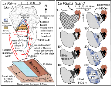 Le dernier effondrement qui s'est produit dans ce chapelet d'iles se réfère à la formation Cumbre Nueva et remonte à 566.000 ans. Ses traces sont parfaitement visibles. L'étude de la structure du volcan Cumbre Vieja indique que les masses impliquées dansun futur glissement représenteraient un volume de 150 à 500 kilomètres cubes. Dans cette hypothèse maximale la plaque ferait 25 km de long, 15 de large et 1400 mètres d'épaisseur. Cette masse mettrait dix minutes à s'étaler en produisant un cône de déjection s'étendant jusqu'à 60 kilomètres en mer en constituant un dépôt sur 3500 kilomètres carrés (...). . La profondeur de l'océan est alors de 4000 mètres. Il faut imaginer ce glissement de terrain comme ce qui se produit lors des nuées ardentes ou des avalanches. Le mouvement serait relativement rapide car la masse glisserait sur un lit de boue, réduisant la friction.