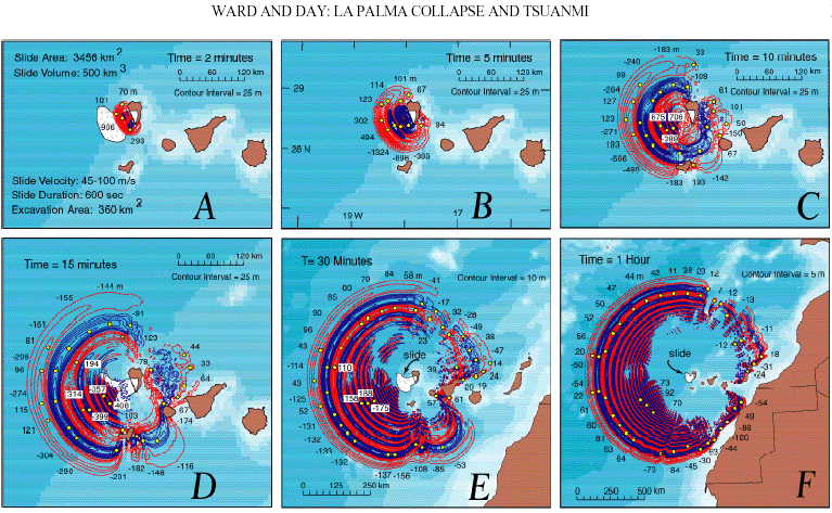 Les auteurs ont ensuite calculé le développement du tsunami qui en résulterait. Deux minutes après la rupture se formerait un dome liquide dont la hauteur atteindrait 900 mètres ( le volcan culmine à 2000 mètres au dessus du niveau de la mer ). Au bout de 50 kilomètres de course la hauteur de la vague atteindrait encore 500 mètres. A 250 km de distance du point zéro sa hauteur serait encore de plusieurs centaines de mètres. Bien évidemment, de telles vagues auraient créé des dégâts considérables sur les îles voisines. Quand la vague atteindrait la côte africaine sa hauteur se situerait entre 50 et 100 m (...). Le phénomène (voir cartes) est non isotrope et se developperait plus activement vers l'ouest.