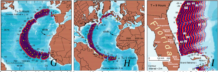 Tout cela défie l'imagination et nous montre à quel point nous restons minuscules par rapport aux moindres soubresauts de la Nature. Etant donné le délai de propagation ( 9 heures ) et le fait que le phénomène serait alors immédiatement signalé de très nombreuses personnes pourraient être évacuées. Encore faudrait-il qu'elles puissent trouver refuge sur des reliefs dépassant les vingt cinq mètre de haut. Je crois qu'on imagine mal quels pourraient être les dégats sur les régions côtières, si par chance on arrivait à minimiser les pertes en vies humaines. Les reliefs de la Floride étant peu accusés on peut dire qu'après le passage d'un tel tsunami le pays présenterait un aspect semblable au sud de Sumatra, le lendemain du 26 décembre.