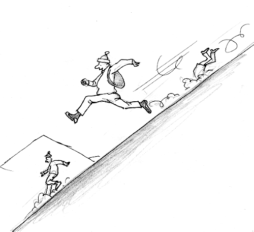 Les phénomènes qui sont engendrés par les effondrements dans la mer le flancs de volcan sont parmi les plus spectaculaires que l'on puisse trouver au monde. Il faut dire que les cônes volcaniques peuvent se constituer de différentes façons. Certains sont formés par des écoulements successifs de lave très fluide, qui se solidifie. Les pentes sont alors assez douces et il n'y a pas a priori de risque d'effondrement. Il n'en est pas de même lorsque ces cônes de déjection se forment par rejet de cendres, qui retombent en pluie. Qu'appelle-t-on "cendre volcanique" ? C'est en général un matériau dont la granulosité est différente de ce que nous appelons communément "cendre" : celle que nous trouvons dans l'âtre de nos cheminées. La cendre volcanique est constituée par des grains relativement rugueux, qui ont de la difficulté à rouler les uns sur les autres. Ils peuvent ainsi constituer des flancs très accusés, instables, dont la pente peut atteindre 40° sur les rejets sont récents. Lors des voyages que j'ai effectués en Islande avec Maurive et Katia Kraft, dans les années soixante-dix j'ai pu me promener sur des flancs aussi accusés et instables. Cela donne d'ailleurs lieu à une sorte de jeu. On peut se jeter sans risque dans certaines pentes bien régulières en faisant "des pas de géant",, en chaussant "les bottes de sept lieues". En effet, imaginez que vous courriez, bille en avant, dans une pente à 40°. Ce ne sont plus des pas que vous faites, mais une succession de sauts que vous enchaînez, de plus en plus longs, de plusieurs mètres. Le problème est de bien se réceptionner sur le talon. Il est difficile, étant donnée l'accélération d'enchaîner plus de cinq ou six pas de ce genre. Dès qu'on ne se réceptionne pas en étant parfaitement droit on passe de cette ample foulée au roulé boulé sans gravité. Amusements de vulcanologues.
