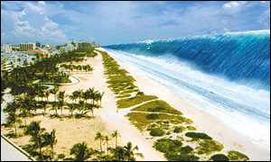 M**enace d'un tsunami qui trouverait sa source lors de l'écroulement d'une partie d'une île des Canaries, consécutive à la proche éruption d'un volcan. Celui-ci affecterait toutes les côtes de l'Atlantique. **