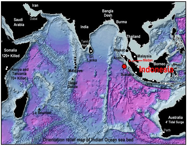 Il reste un fait : les populations les plus touchées se situent dans la partie nord ouest de Sumatra, fief des intégristes séparatistes islamistes indonésiens où on compterait à ce jour (12 janvier 2005) plus de cent mille morts. La ville de Banda Ache a simplement été rayée de la carte, ainsi que bien d'autres localités de cette partie de l'île. C'est Sumatra qui a de toute façon payé le plus lourd tribut à la catastrophe. Le drame a entraîné un mouvement humanitaire sans précédent. Mais les sauveteurs, dépêchés sur place ont pu constater un fait sans précédents. Ils n'ont trouvé que de rares survivants. Peu de blessés, seulement des morts innombrables, broyés, défigurés. Si ce tsunami avait une origine artificielle, quel genre d'hommes pourraient ordonner et mettre en place ce type "d'opération spéciale" ? Si c'était le cas, on trouverait là un "réponse des plus musclées" à l'attentat de Bali (île située un peu plus à l'Est, pratiquement sur le bord droit de la carte reproduite, pour fixer les idées). Les destructions ont été telles que les équipes de secours n'avaient ... plus rien à faire qu'à extraire et à ramasser les corps. Il n'y avait que peu de gens à soigner. Le tsunami a été "du tout ou rien".