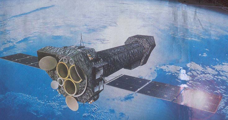 Les scientifiques sont très contents des observations qui ont pu être réalisées dans la gamme des rayons X à l'aide des télescopes XMM et Chandra. Ci-après, une image d'artiste du téléscope XMM à rayons X :