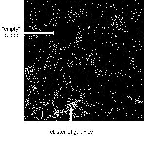 De quel tableau parle-t-il, ce brave garçon ? L'article reste muet sur ce sujet. Je suis allé en juin 2001 à un colloque international d'astrophysique et d'astronomie, qui s'est tenu à Marseille. Le thème général était "Where is the matter ?" (Où est la matière ?). Dans ce genre de rencontre on confie à des gens le soin de faire des "surveys", de "revues de question" sur différents sujets. Je me souviens qu'un italien dont j'ai oublié le nom avait été chargé de faire le point sur ce qu'on pouvait savoir sur la VLS, la "very large structure", la structure à grande échelle de l'Univers. Ma foi, maintenant les gens ont des télescopes de plus en plus puissants. Huit mètres de diamètre, c'est quasiment un standard, de nos jours. Ajoutez les vertus de l'optique adaptative, de l'astronomie spatiale, et tout le tremblement. Bref, les observations se font de plus en plus précises. Cet italien nous a donc montré des coupes du cosmos, s'étendant jusqu'à des distances de plusieurs centaines de millions d'années-lumière. Ma fois, ma mémoire ne vacille pas encore. J'ai vu des tas d'images montrant que cette structure lacunaire du cosmos, à grande échelle, découverte au début des années soixante-dix, semblait décidément se confirmer. De quelque côté que l'on se tourne, sous n'importe quel angle, quelle que soit la façon dont on découpe l'univers en tranches, on retrouve cette même structure en "bulles jointives". Puis le chairman a présenté des résultats de simulations arachénéennes :
