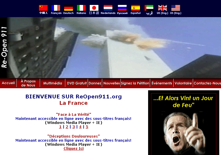 La homepage réapparaissait alors, en langue française, proposant de visionner en streaming le document " Painful Deception " de 2 h 40 , contre-enequête effectuée par un groupe de courageux Américains à propos des évènements du 11 septembre 2001, et demandant la réouverture de l'enquête. Nombre d'éléments soulignés sont effectivement plus que troublants et l'analyse des lacunes du document représentant le résultat de l'enquête officielle fait état de vastes pans d'ombre qui ne sont pas sans rappeler ceux du rapport Warren, lors de l'enquête sur l'assassinat de Kennedy.