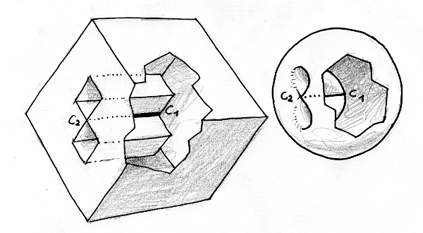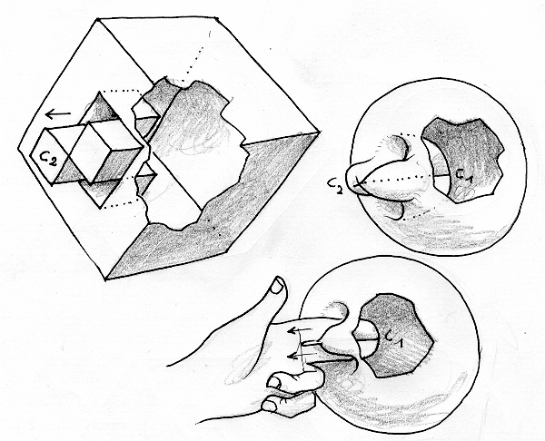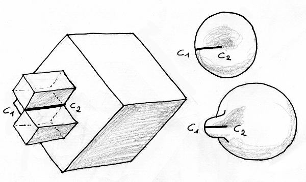 Dans la figure en bas et à droite on s'est arrangé pour loger les deux points cuspidaux C1 et C2 situés à l'extrêmité de sa ligne d'auto-intersection dans ce qu'on peut considérer comme une portion de sphère. Nous savons que nous pouvons retourner une sphère. Donc nous pouvons faire subir à cet objet le même traitement, sans nous préoccuper des différentes étapes de cette transformation. En polyédrique cela consistera à retourner le cube.