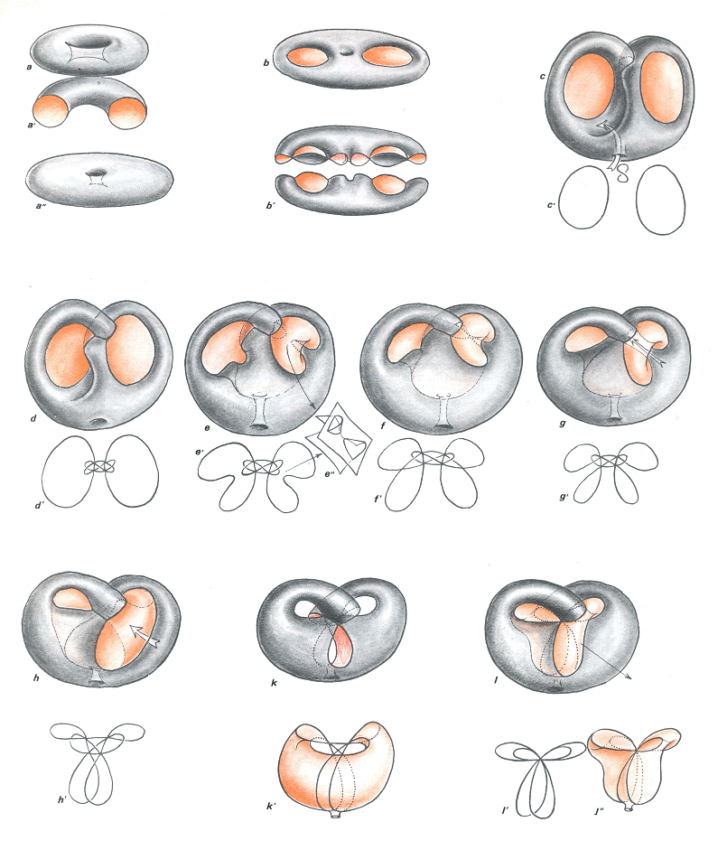 Le "tore standard", dessiné au centre de la feuille, appartient à la même famille que l'objet figuré en b. C'est ce que j'ai au passage montré dans la version du retournement du tore que j'ai inventée en 1980. La famille évoquée en a représente un tore qui a subi un vrillage de 360°. Il ressemble au tore standard mais les deux se définissent à partir de leur système de cartographie, à l'aide de deux familles de courbes. Dans le tore standard on utilise deux ensembles de cercles assimilés à des méridiens et à des parallèles. Sur le tore a on devrait compléter la famille de cercles collée dessus par une seconde famille, se vrillant en sens inverse. Ce qu'on peut montrer alors c'est qu'il est impossible, à l'aide d'un homotopie régulière d'amener le maillage de ce tore a en coincidence avec le maillage du tore standard ( cercles méridiens plus cercles parallèles ). C'est en ce sens que ce sont des objets différents. Tous ces objets peuvent évidemment se configurer selon un revêtement à deux feuillets de la bouteille de Klein.