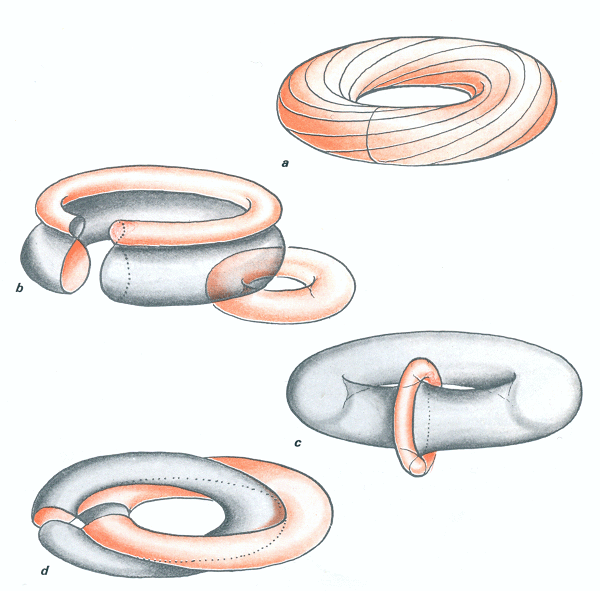 La puissance des outils du géomètre est de pouvoir prédire ce qui est possible et ce qui ne l'est pas. Transformer le tore standard en tore de la figure b : oui. Passer de c à d : non.