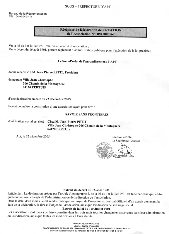 Mon ami Gilles d'Agostini et moi-même avons mis la dernière main aux statuts et les avons déposés à la sous-préfecture d'Apt le 11 décembre 2005. Les voici . Ils resteront accessiblessur site en permanence et sans limitation de temps. Il est prévu que les comptes de l'association soient accessibles en temps réel aussi bien par les adhérents que par les non-adhérents, sur le site. Moins de la moitié des 275 chèques renvoyés sont rentrés. Nous espérons que les donateurs effectueront le changement d'intitulé. Après le dépôt des statuts, le retour du récipicé suivront nous attendons la publication au Journal Officiel, en principe mi-février, compte tenu des délais pour pouvoir ouvrir un compte. Alors nous pourrons commencer à payer aux traducteurs l'argent que nous leur devons déjà et faire face à des nouvelles traductions. L'association, en date du 16 janvier 2006 démarrera avec la possibilité de payer la traduction de 61 albums. Ainsi cette association se comportera comme une usine à traduire en direction du plus grand nombre de langues possible. J'ai déjà mis en chantier de nouveaux albums de " Bande Dessinée scientifique ", un genre que, pour le moment, je suis apparemment le seul à maîtriser.
