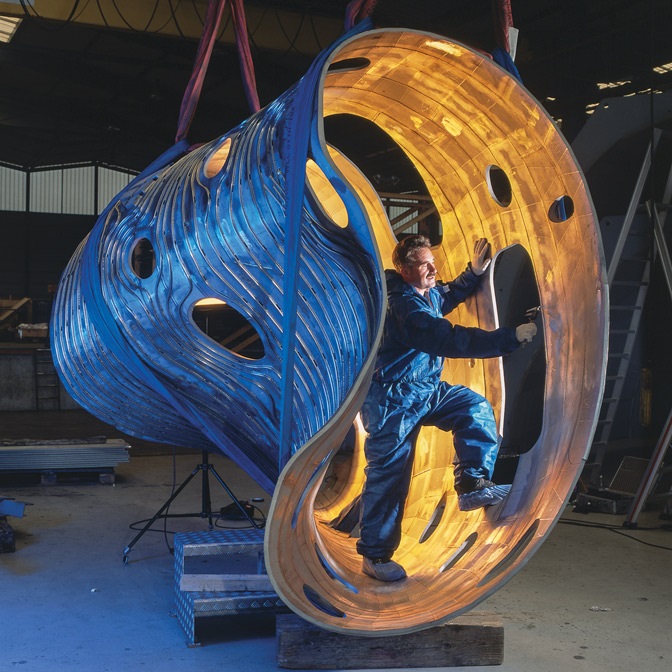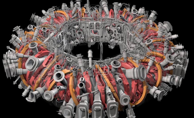 En jaune, la chambre de la machine, en bleu les nombreuses bobines. Lors de sa conception le Stellarator allemand a fait l'objet de nombreux calculs sur ordinateur pour optimiser la forme de sa chambre ainsi que le dessin de ses bobines. Tout cela a demandé un énorme travail et un million d'heures de travail.
