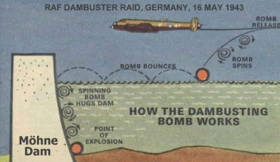 Si on avait fait exploser les charges contre la paroi extérieure du barrage, l'effet aurait été négligeable, parce que l'énergie aurait été dissipée dans l'air, compressible. Mais l'eau est un milieu incompressible. Quand les bombes explosèrent contre la paroi intérieure du barrage, sous l'eau, celle-ci se comporta comme un réflecteur. Le choc sismique communiqué au béton s'avéra suffisant pour provoquer des fissurations décisives. Mais on doit bien garder en tête que ce ne sont pas les bombes qui ont cassé le barrage, mais la pression de l'eau. Les charges ne jouèrent qu'un rôle de déclencheur.