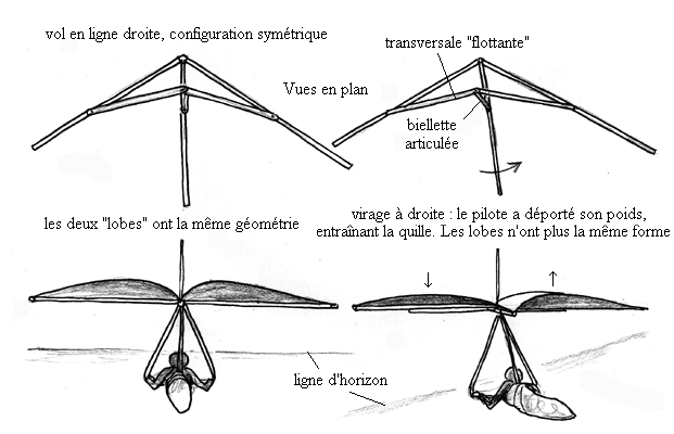 ** ...Le résultat : un extraordinaire gain en manoeuvrabilité, fut immédiat. Lorsque le pilote déportait son poids sur le côté, en entraînant la quille, solidaire du trapèze, avec lui, il déformait la voilure. Les dessins présentent cet effet de manière très exagérée. Mais on imagine aisément le résultat. En aplatissant l'un des "lobes" d'un centimètres, alors que l'autre se creusait d'autant tout se passait comme si on avait doté les deux ailes d'ailerons courant sur tout le long du bord de fuite. Le confort de pilotage changea du tout au tout et la sécurité s'accrut.