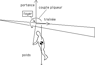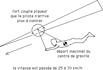 ...Rappelez-vous : dans les ailes Rogallo, c'est le déport vers l'arrière du poids du pilote qui contre le couple piqueur et rien d'autre. A partir d'un certain moment ( le couple piqueur croissant par ailleurs comme le carré de la vitesse ) le pilote ne parvenait plus à redresser sa machine :