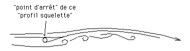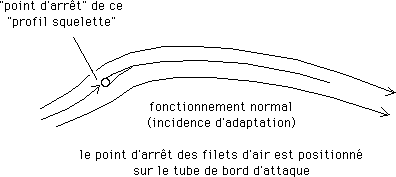 ...C'était faux. Les Manta étaient bel et bien des engins fort dangereux. Voici pourquoi. Comme on peut le voir sur un dessin présenté plus haut, l'aile Rogallo est un "profil squelette". Il existe une incidence optimale, dite "incidence d'adaptation", sous laquelle le profil travaille au mieux. Le point d'arrêt (point où s'écoulement gazeux se scinde en deux, la partie supérieure filant sur l'extrados et la partie inférieure sur l'intrados) se localise alors sur le tube-bord d'attaque, rigide.