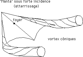 ...Deux "vortex" se forment alors qui ont un effet stabilisateur sur l'écoulement. Il en est de même pour des voilures Rogallo (Manta).