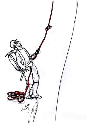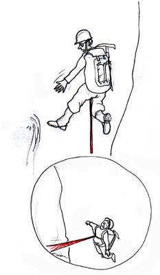 ...Ensuite, il aurait coupé la corde, en utilisant l'opinel qu'ils aurait dû normalement avoir autour de son cou, attaché par un lacet, sous son pull. Son coéquipier en aurait été quitte pour une petite frayeur, un petit mètre de chute. Mais les noeuds de Prussik ne glissent pas et il est facile, après coup, de verrouiller l'affaire en nouant la corde. Cette manoeuvre effectuée, le second de cordée serait redevenu manoeuvrant. Il aurait pu se dresser sur des "pédales", renforcer sa position en plantant un piton supplémentaire. Puis il aurait sorti de son sac un corde de secours, plus fine et moins longue, avec laquelle il aurait pu porter secours à son compagnon, en lui descendant éventuellement du matériel.