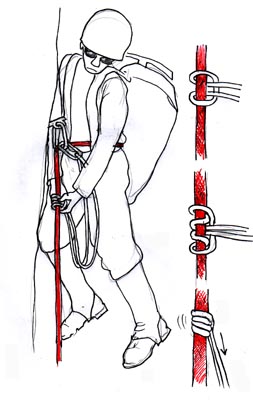 ...Or, ils auraient pu s'en sortir par eux-mêmes. Tous les alpinistes emmènent avec eux des "anneaux de corde". A cette époque, il s'agissait de nylon trois brins, épissuré. De nos jours on utilise aussi des sangles cousues. Avec un tel anneau, même dans une position aussi inconfortable, celui qui était en haut pouvait très bien créer un lien entre un mousqueton attaché au piton qui les retenaient tous les deux et la corde, en utilisant un "noeud de Prussik" :
