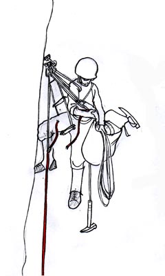 ...Celui-là aurait alors dû remonter le long de la corde principale en utilisant deux ou trois anneaux de corde frappés à l'aide de Prussik (à l'époque les "Jumard" n'avaient pas encore été inventés). En une heure tout aurait été réglé. En étant quitte pour la peur, les deux auraient pu soit redescendre en rappel, soit bivouaquer, soit terminer leur ascension. Tout, sauf rester pendus pour finir gelés.