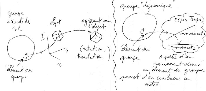 J'avais dis plus haut que le groupe "sécrétait les objets géométriques". Plus encore : ils "sécrètent" la géométrie, l'espace qui leur convient. Le groupe d'Euclide "sécrète" l'espace euclidien. Mais l'espace où nous vivons n'est pas parfaitement euclidien, partout, sinon on n'aurait d'effets de lentille gravitationnelle. Mais, pire encore, il n'est pas "galiléen", du tout, à cause de la Relativité Restreinte. Donc le groupe de Galilée qui gérait tout cela n'était pas le bon. Il a fallu "changer de géométrie", donc "changer de groupe", ce qui revient au même. Le groupe de Poincaré a remplacé le groupe de Galilée. Avec lui on peut, à partir d'un mouvement particulier, utiliser un élément du groupe et fabriquer un autre mouvement.