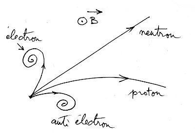 Dans une chambre de Wilson il se produit un phénomène semblable. Elle est emplie de vapeur d'eau en état supercritique. La moindre remue-ménage, comme le passage d'une particule, suffit à créer cette condensation de valeur d'eau. Je me souviens de ce que j'avais vu, quand j'étais gamin. La pièce était faiblement éclairée, de telle manière qu'on puisse nettement apercevoir ces traînées fugitives se produisant dans cette chambre vitrée, de la taille d'un aquarium. Elles apparaissaient instantanément, puis, dans cette enceinte "il se mettait à pleuvoir". On voyait de légères écharpes de vapeur d'eau se former et se dissoudre en un temps de l'ordre de la seconde. Cela pouvait se produire sous l'effet du passage d'un neutron, d'un proton ou d'un électron. Un neutron est insensible à la présence d'un champ magnétique. Par contre un tel champ provoque la giration d'un proton. Le sens de rotation dépend de la direction du champ. Si le champ B est dirigé vers le haut, le proton tourne à droite. Son rayon de giration, ou "rayon de Larmor" dépend de l'intensité du champ magnétique. Les électrons tournent dans l'autre sens, ici, à gauche.