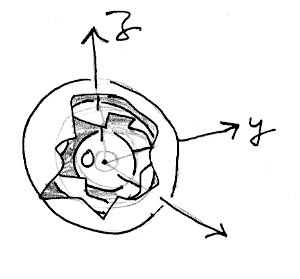Vous remarquerez que pour obtenir l'image énantiomorphe d'un objet, dans un espace 3d euclidien il suffit, en décrivant ses points à l'aide d'un repère orthonormé OX, OY, OZ de changer par exemple la coordonnées x en - x. On obtient alors le symétrique de l'objet par rapport au plan YOZ, faisant office de miroir. Dans le groupe d'Euclide il y a des éléments (des matrices qui "agissent" sur les coordonnées x , y , z ) qui inversent la coordonnée x, donc donnent l'image en miroir des objets par rapport au plan x = 0, au plan YOZ.
