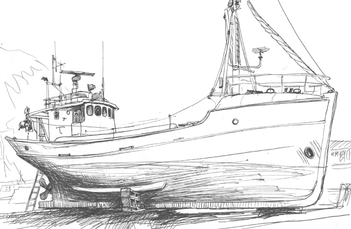 Heimaye est aussi un port et dans celui-ci se trouve un chantier naval. Les habitants de Vestmann peuvent y tirer à terre leurs unités de pêche. J'avisais un chalutier assez joli ma foi, et j'entrepris d'en faire un croquis, que voici, ci-après :