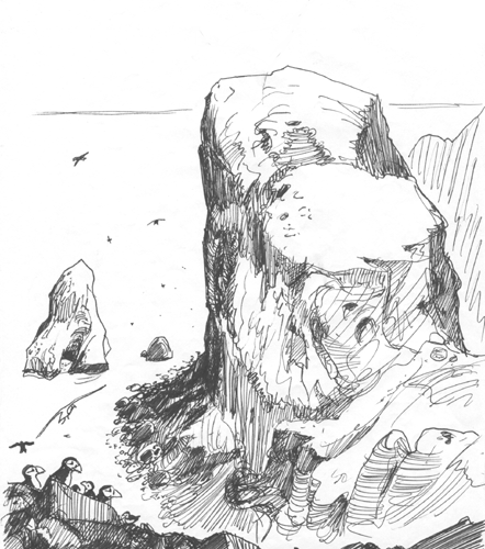 L'affaire ne se fit pas et le type repartit, fou de rage. Fichtre, j'en ai vendus des dessins de par le monde depuis que j'ai douze ans. Ca a été mon seul échec, mais de taille. Pour un propriétaire de bateau, un chouette dessin comme, cela compte. Il devait déjà le voir encâdré, en bonne place dans son salon. Mais sans doute que, depuis des générations, jamais un étranger n'avait franchi le seuil de sa demeure et il préféra camper sur ses positions de peur que ses voisins n'apprennent qu'il avait transigé à la règle. Mes compagnons de voyage n'eurent pas plus de chance que moi. Le seul qui parvint à pénétrer dans une maison de Vestmann fut ... mon fils. Les gosses sont moins bêtes que les adultes. Il avait joué avec des enfants du village. Les mômes discutent par geste et parlent d'emblée la langue importante : celle du coeur. C'est plus tard qu'ils l'oublient. Dans l'après midi une mère avait appelé toute la bande à l'intérieur de sa maison, pour un goûter. Comme Jean-Christophe était blond comme les blés et ressemblait à un petit Viking, il fut du lot. Ainsi il réussit là où nous avions échoué.