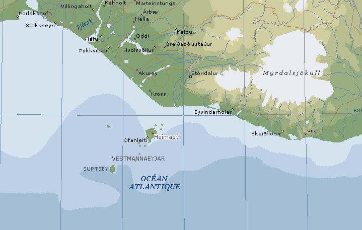 Sur cette vue générale de l'Islande on retrouve, en bas, l'archipel de Vestmannaeyjar. Un petit triangle rouge signale le sommet du volcan Hekla, qui culmine à 1491 mètres. La grande tache blanche est le glacier du Vatna, dont je crois que c'est le plus grand du monde. Le noms islandais m'ont toujours semblé merveilleusement imprononçables. Trouvez sur la carte :