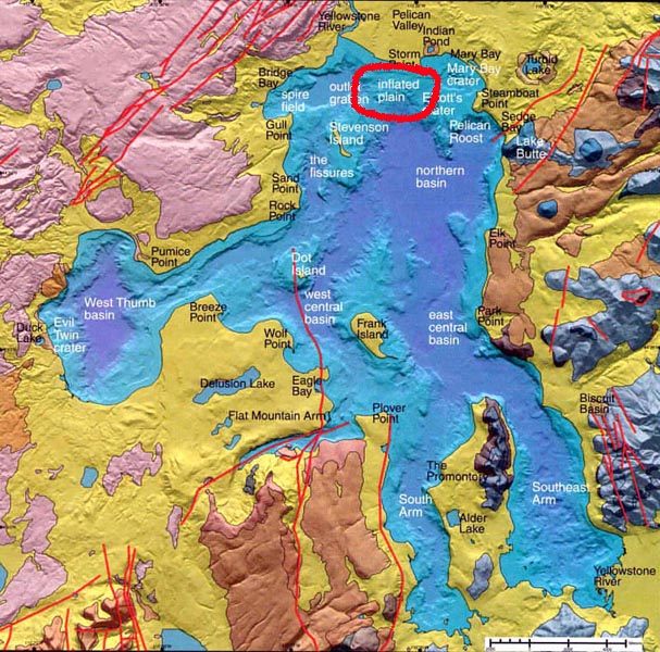 La carte ci-dessus montre le déplacement, vers le sud ouest, des événements vulcanologiques en fonction du temps. Yellowstone se situe à la verticale d'un "point chaud", c'est à dire de l'extrêmité d'une remontée de magma chaud en provenance des tréfonds de l'écorce terrestre, qui joue le rôle d'un "chalumeau". Il existe à Yellowstone un lac, circulaire. Fin juillet 2004 les géologues ont découvert que le fond de ce lac était remonté de ... 30 mètres. Sur la carte ci-après la zone où cette remontée de fond a été constatée. Quant à la température de l'eau à cet endroit, elle atteint actuellement 88° et ne cesse de croître. Il faut garder en tête que le parc est à une altitude relativement élevée. Ce lac est maintenant fermé au public et sa température se couvre de poissons morts (source : The Idaho Observer). La situation est identique dans la rivière Yellowstone ainsi que dans les différents cours d'eau de la région qui charrient également nombre de poissons passés de vie à trépas. Beaucoup d'aires de pique-nique ont dû être fermées. Dans de nombreuses régions du parc la durée des visites se limite d'elle-même à quelques heures tant la puanteur des remontées sulfureuses est devenue insupportable.
