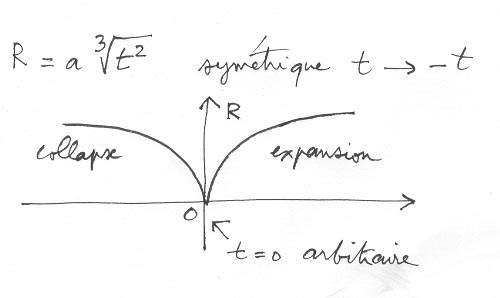 אם הפתרון של אינשטיין-ד'סיטר מתאר התפשטות איטית, מהתנאים ההתחלתיים... פורצי-הכפכפ, הוא סימטרי בהחלפת t ב- -t. אנו מקבלים שתי פרבולות סימטריות ביחס לזמן t = 0, שברור שהוא שרירותי. אם נקרא את העקומה משמאל, נקבל תיאור של הכפפת כבידתית, שמתאצת בעצמה.