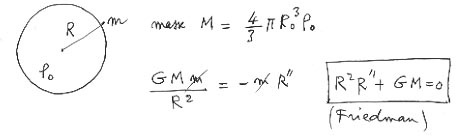 נניח כדור מלא "עפר", כלומר צפיפות קבועה של נקודות מסה נייחות. הכדור מתאפיין בקריים R. הוא מייצג מסה M. נבחן מסה m הנמצאת על פני הכדור. נרשום את חוק ניוטון. נקבל, תוך שתי שורות של חישוב, את משוואת פריידמן, אותה המשוואה של מודלי קוסמולוגיה שנקראים על שמה: